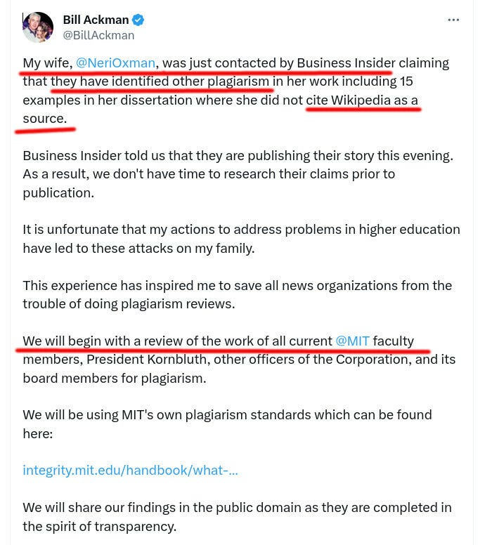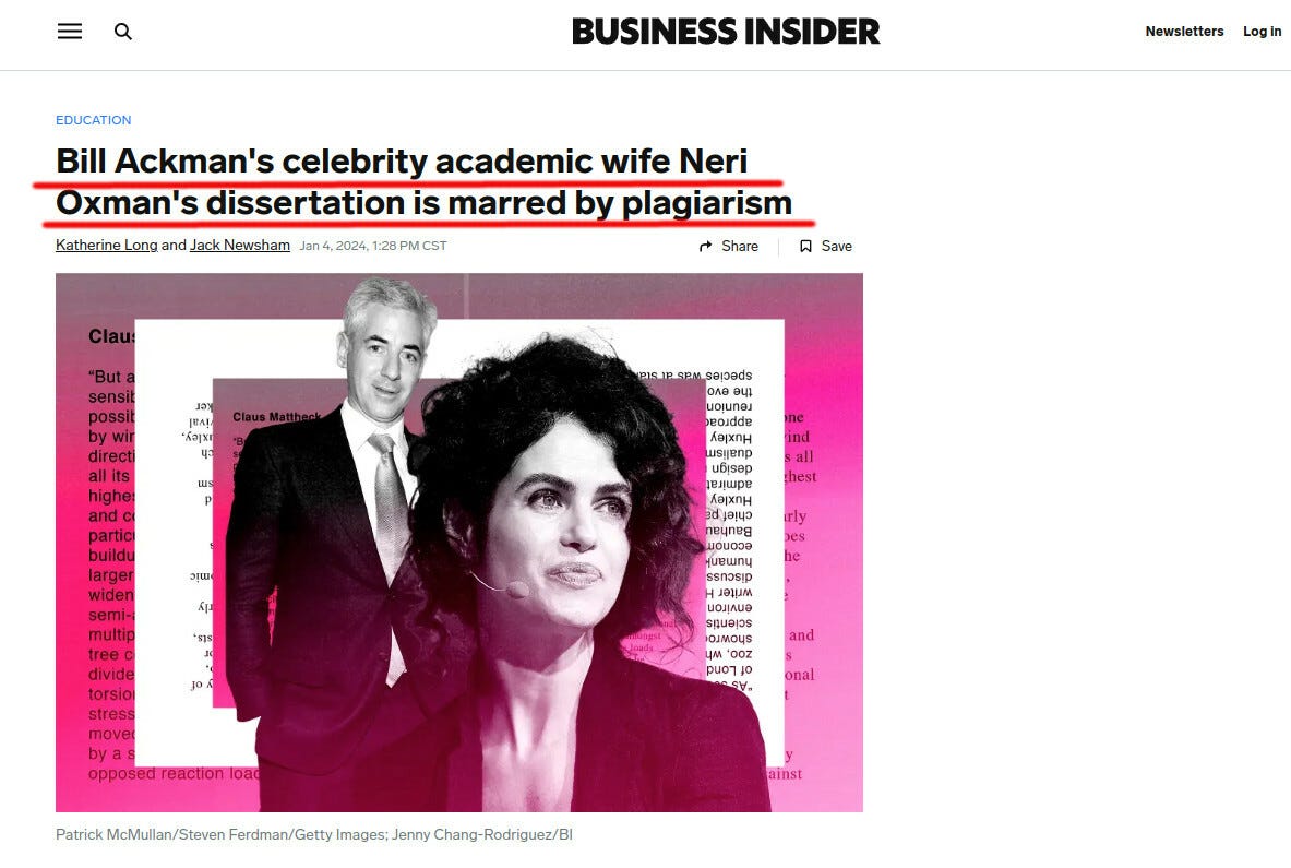 Since then, the “plagiarism scandal” widened. Bill Ackman, a billionaire at the forefront of efforts to fire certain academics, found his own family at the center of attention of certain revenge-minded Internet sleuths. They found that Ackman’s wife, Neri Oxman, is also a plagiarist, and her MIT dissertation violated MIT's standards.
