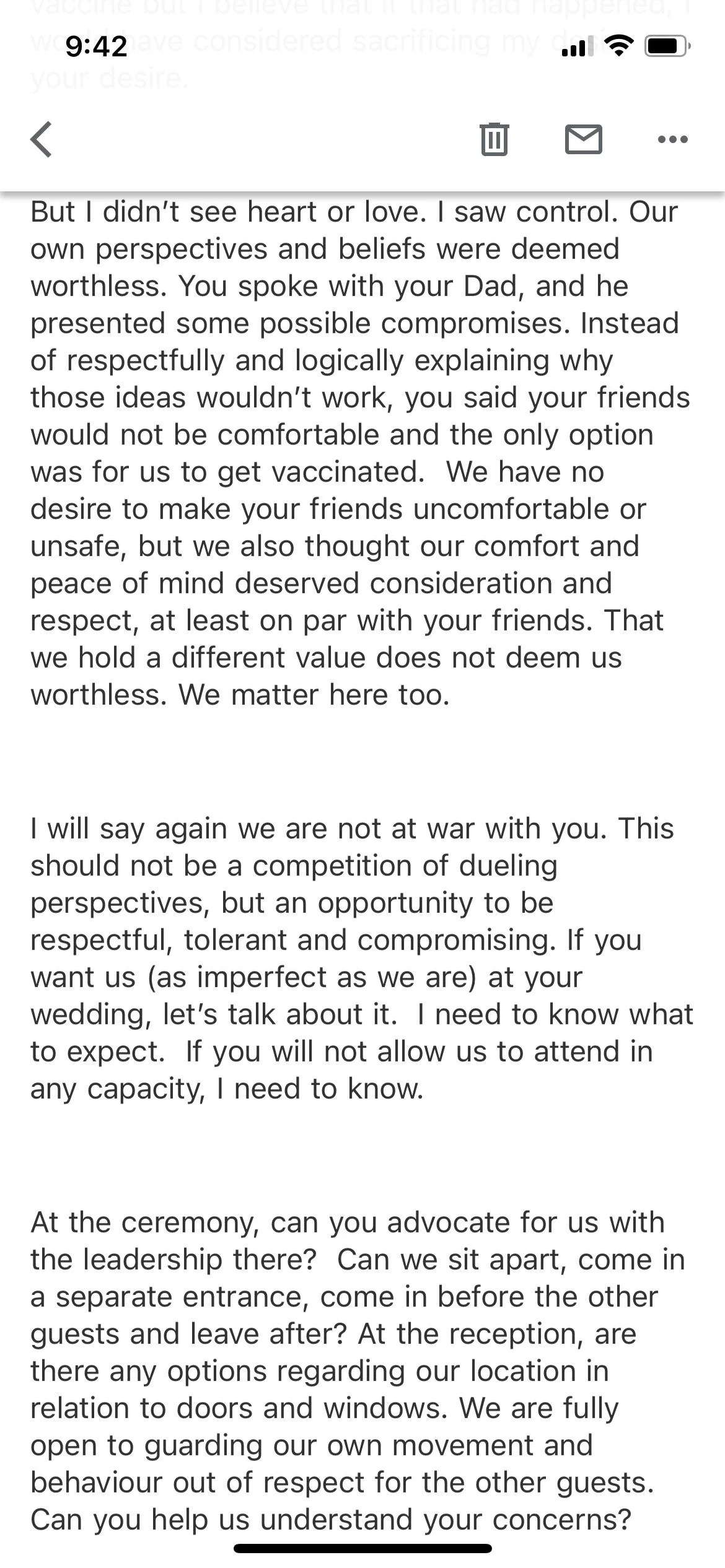 I was kicked out of my running group for not vaxxing, I couldn't go into the office for not vaxxing, and my brother told my mom in the spring of 2023 that my wife and I belonged in a camp for being unvaxxed.