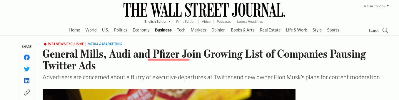 What is interesting is that this advertising pause involves not only Pfizer but other large multinationals with no specific issues related to Twitter censorship, such as General Mills, a producer of popular but unhealthy breakfast cereals.