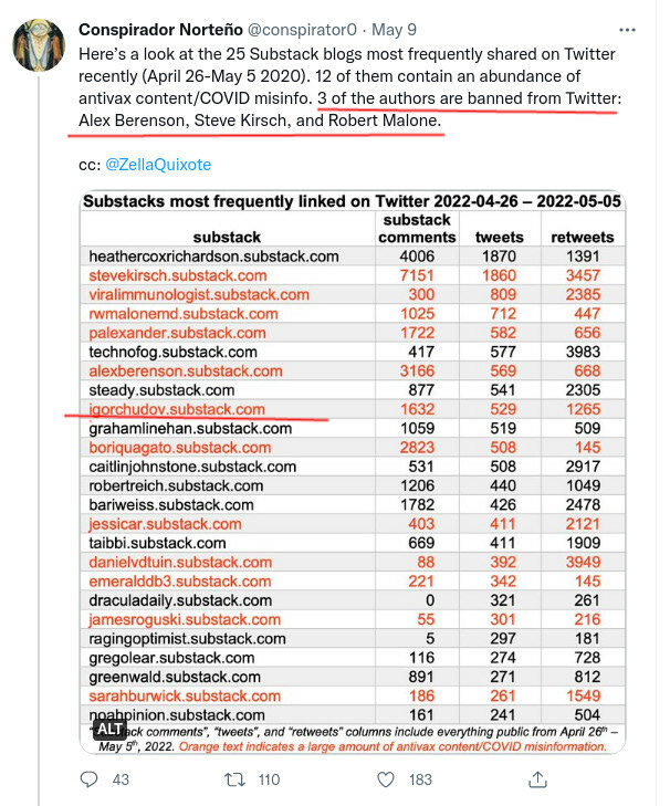 This person analyzed the most popular substacks. Mine is #6 among the orange-colored “anti-vax misinformation substacks”, thanks to you, my readers, for liking and sharing some of my posts.