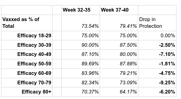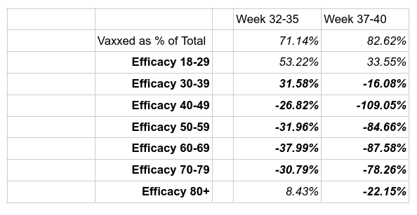 In other words, as of now, the vaccine has NEGATIVE efficacy for all groups except 18-29 year olds. (who need the vaccine the least, incidentally)